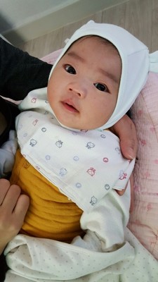 둘째 아기의 입가에 모유가 약간 비치는 모습이 관찰되구요