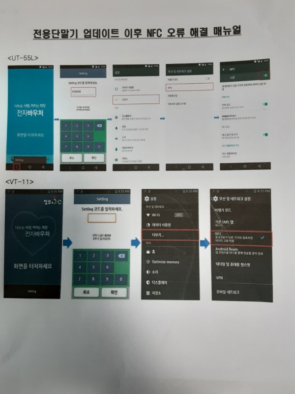 안녕하세요 단말기 업그레이드를 잘 진행주셔서 감사합니다. 사회보장정보원에서 단말기 업그레이드시 오류가 발생하여 기존 일정보다 기간을 연장하였습니다. 그리고 추가 오류 발생 시 NFC설정을 해야하는 데 내용은 다음과 같습니다. 정상적으로 단말기 업그레이드 프로그램 설치 후 결제 시도하실 때 카드를 읽지 못하거나 화면이 정지된 경우 기타 오류가 발생하면 다음과 같은 방법을 설정해주시기 바랍니다. 설정->setting code(626638)입력->더보기->NFC->"사용"또는 체크 ** 두가지 단말기 중 해당하는 단말기 참고하셔서 진행해주세요. 확대해서 보시면 크게 보입니다.