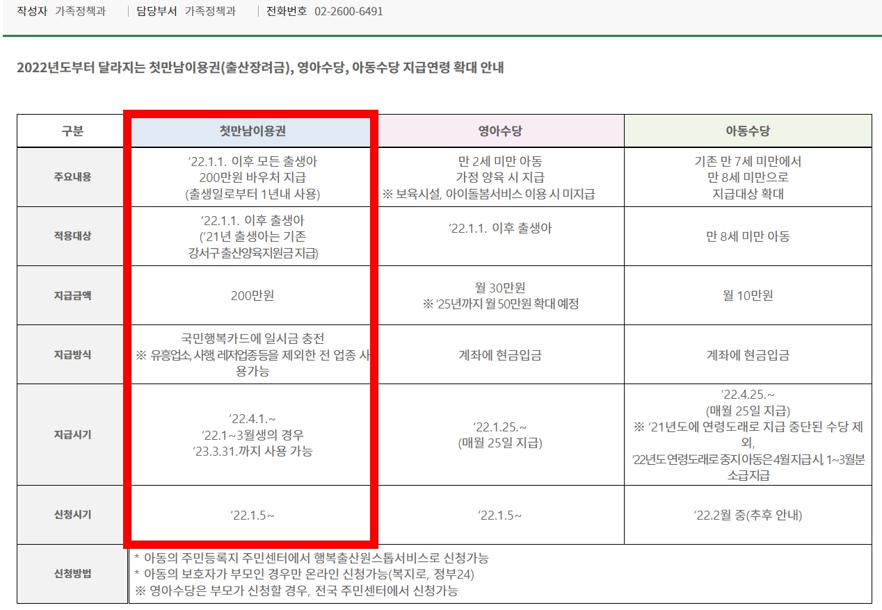 감사합니다♥ 출처 : 강서구청 - 공지/새소식 https://www.gangseo.seoul.kr/gs040101/275985 출처 : 보건복지부 - 연구/조사/발간자료 / 2022년 첫만남이용권 사업업내 - PDF 자료 중 발췌 |