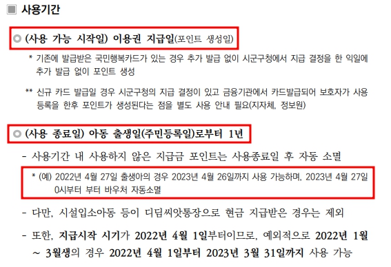 ●2022년도 "첫만남이용권" ○대 상 : 2022년 01월 01일 이후 출생하는 아이 ○지원내용 : 바우처 포인트로 200만원 지급 (국민행복카드) ○지급시기 : 2022년 04월 01일 ~ ○신청방법 : (아래의 ① 또는 ②의 방법으로 신청) - ① 관할 동의 주민센터 방문 신청 - ② 온라인-복지로에서 신청 ○사용가능일 : 이용권 지급 시점 ○사용종료일 : 아동 출생일(주민등록일)로 부터 1년 (예시. 두번째 사진 참고) ○사용범위 : 세번째 사진 참고.