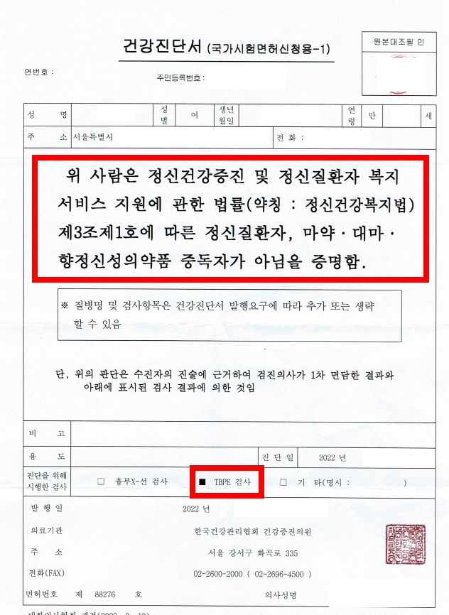 안녕하세요. 관리사님 ^^ 2023년도 보건증, 건강진단서를 검사받으시고 사무실에 제출을 해주세요. ●보건증 : - 폐결핵, 세균성이질, 장티푸스 항목이 꼭 있어야 합니다. ●건강진단서 : -"제3조제1호에 따른 정신질환자, 마약,대마,향정신성의약품 중독자가 아님을 증명함" 의 문구가 받드시 기재되어야 합니다 -TBPE 항목 체크가 되어 있어야 합니다